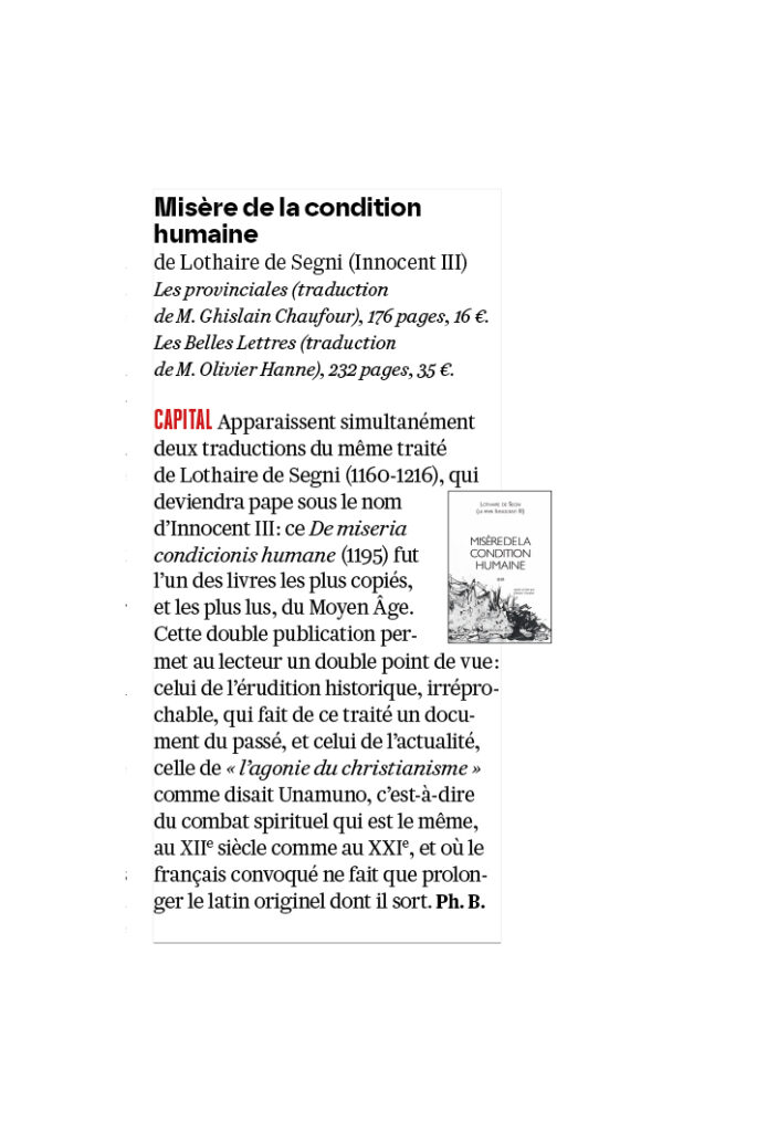 « CAPITAL. Apparaissent simultanément deux traductions du même traité de Lothaire de Segni (1160-1216), qui deviendra pape sous le nom d’Innocent III : ce De miseria condicionis humane (1195) fut l’un des livres les plus copiés, et les plus lus, du Moyen Âge. Cette double publication permet au lecteur un double point de vue : celui de l’érudition historique, irréprochable, qui fait de ce traité un document du passé, et celui de l’actualité, celle de « l’agonie du christianisme » comme disait UNAMUNO, c’est-à-dire du combat spirituel qui est le même, au XIIe siècle comme au XXIe, et où le français convoqué ne fait que prolonger le latin originel dont il sort. »